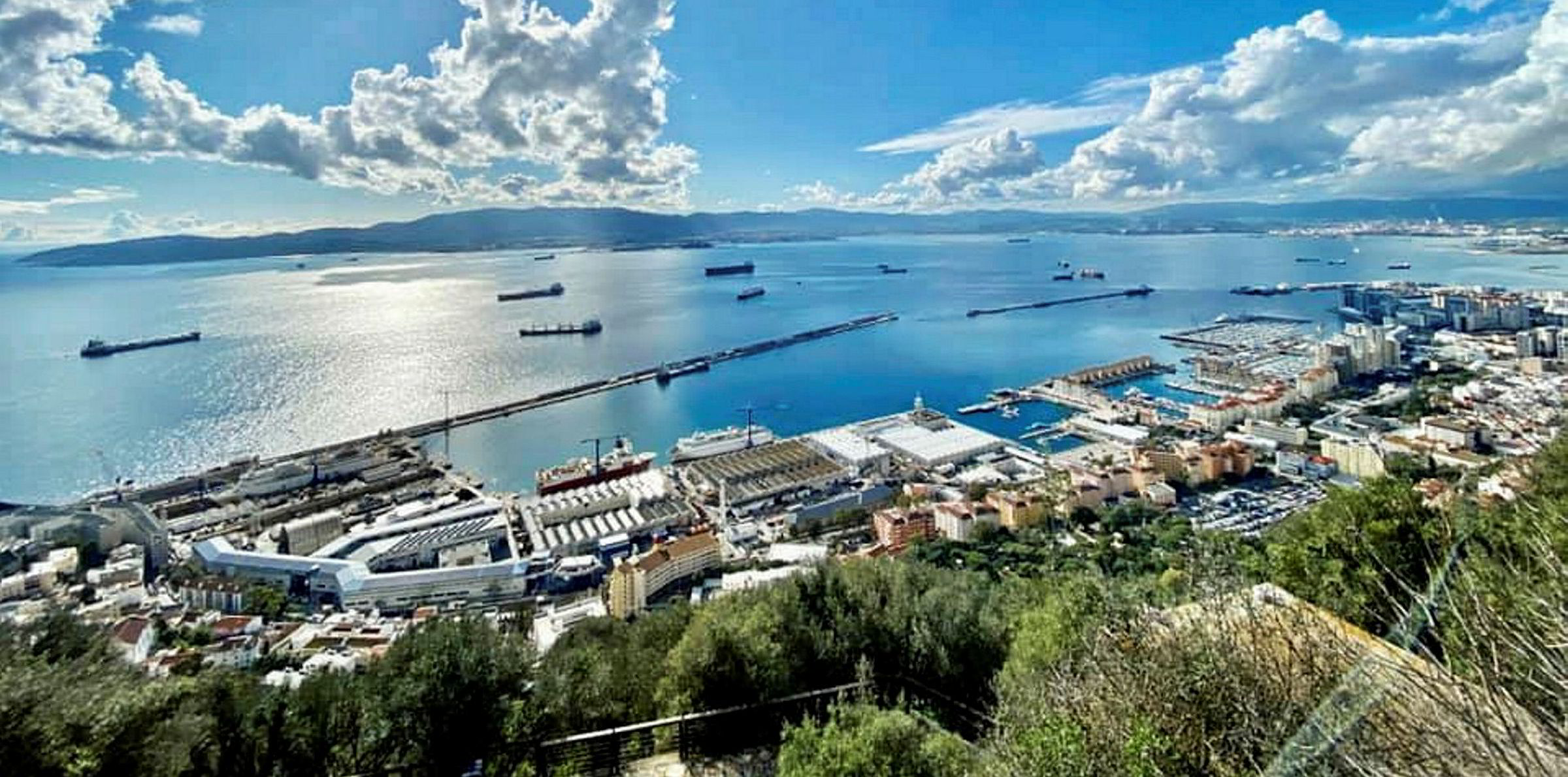 The landscape is dominated by the rock of gibraltar at the foot of which is a.